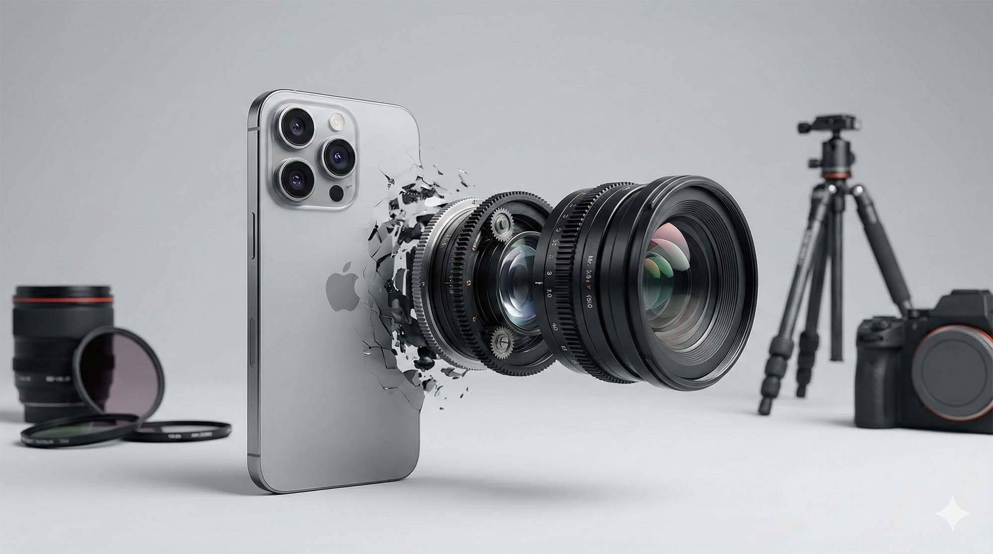 概念圖展示 iPhone 轉變為專業相機鏡頭的過程,象徵舊機換新機 / Conceptual art showing an iPhone transforming into a professional camera lens, symbolizing trading in old tech for new gear.